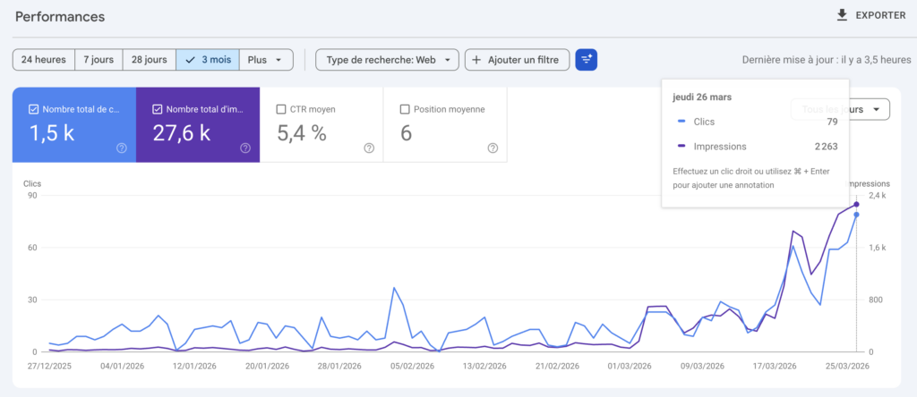 Les performances enregistrées via la Google Search Console sur les trois premiers mois sont exceptionnelles pour un domaine récent :Nombre total de clics : 28 100 clics générés depuis le lancement…