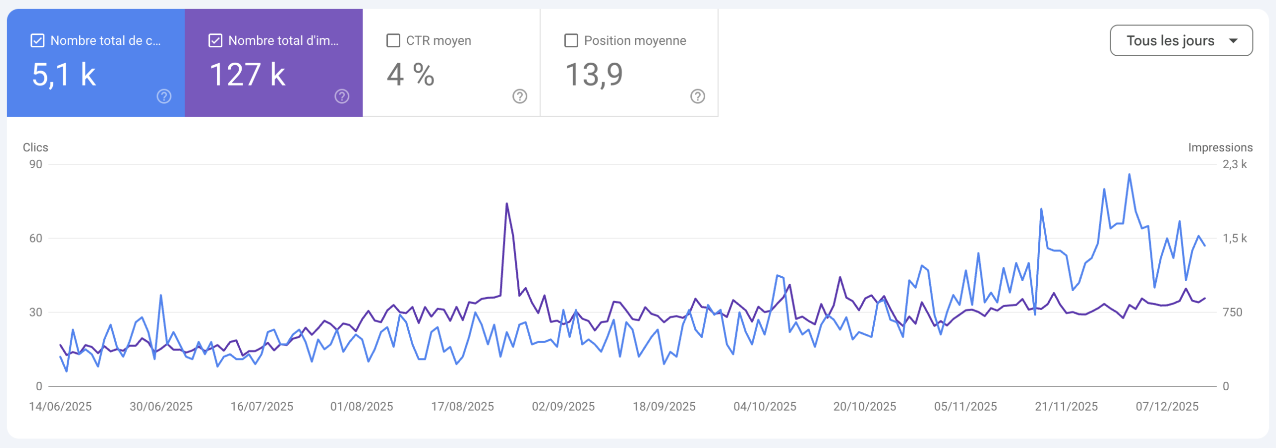 Le pic de fin d’année visible sur la Search Console n’est pas un hasard. Nous avons anticipé la saisonnalité en optimisant très tôt les pages stratégiques pour Noël : les fiches produits des Calendriers de l’avent Kâliner et des coffrets de truffes/rochers ont été retravaillées (contenu enrichi, balisage) pour être parfaitement indexées au moment où les recherches des internautes décollaient.